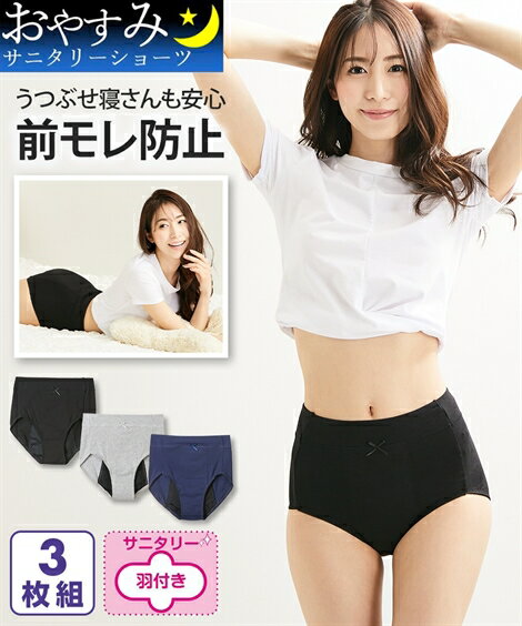 ショーツ(パンツ) (LL-3L) 大きいサイズ おやすみ サニタリーショーツ うつぶせ寝さん 前に長い防水布前モレしにくいお腹らくちん 深ばき サニタリーショーツ夜用 3枚組 (羽付ナプキン対応)